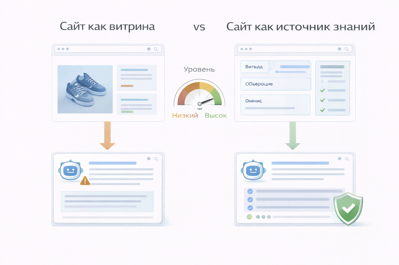 Когда на сайте каждая статья «про одно и то же, но по-разному», ИИ не видит целостной экспертизы. Он видит набор разрозненных мнений.